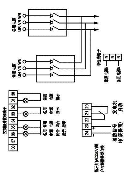 B型:其功能包括:手动-自动转换、失压、欠压、超压与断相转换、转换延时设置,提供发电机启动触头,LED显示。可增加消防